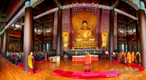 评语:大殿雄伟宽阔,佛像庄严肃穆,海众云集,颂佛祝祷。该图采用超广角拍摄,使画面更具视觉效果,展示了圣殿的庄严与宏大,体现了峨眉山众僧对佛教文化的传承与发扬。